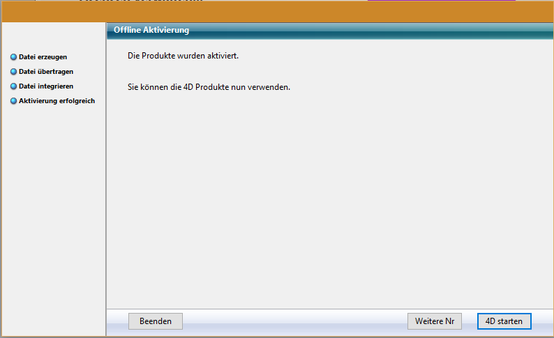Haben Sie 4D erfolgreich installiert, müssen Sie das Produkt aktivieren, damit Sie es verwenden können. Die Aktivierung ist auch erforderlich, wenn Sie zusätzliche Lizenzen erworben haben und verwenden wollen.