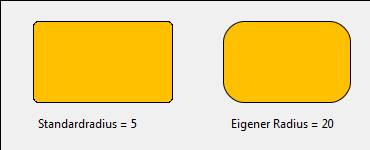 Der Mindestwert ist 0, in diesem Fall wird das Viereck ohne gerundete Ecken gezeichnet. Der maximale Wert richtet sich nach der Größe des Vierecks und wird dynamisch berechnet. Er kann maximal halb so lang wie die kürzere Seite des Vierecks sein.