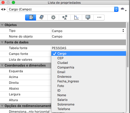 Para converter um campo em uma variável ou vice-versa, selecione o objeto e selecione Campo ou Variável da lista Tipo na Lista de propriedades, (tema “Objetos”). A Lista de propriedades é atualizada para mostrar as propriedades do novo tipo de objeto. O nome de objeto, o método de objeto e suas propriedades (tamanho, editável, etc.) são conservadas.