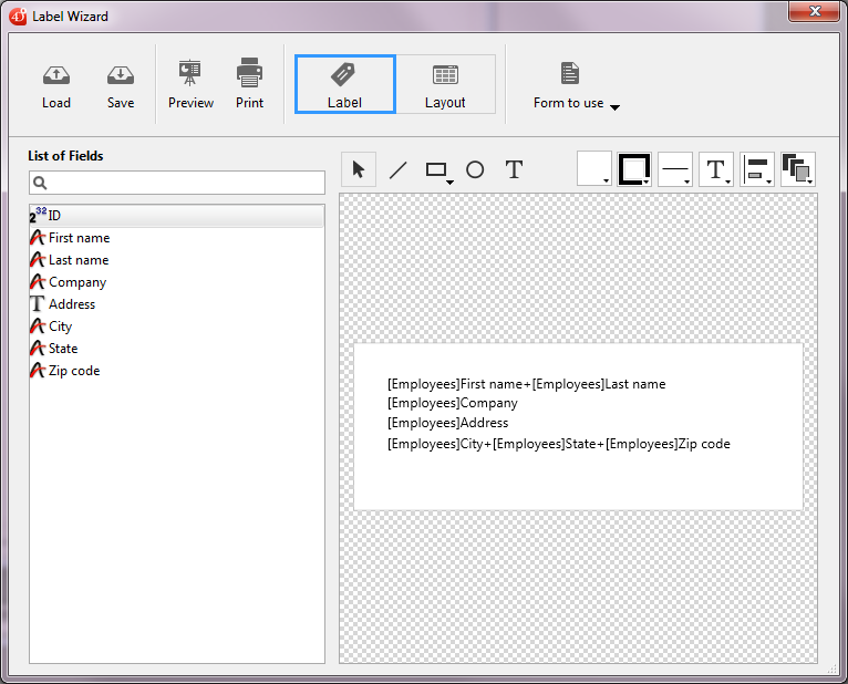 以下の例では、ユーザが[People]テーブルを検索し、ラベルウィザードを表示して任意のラベルの設計、保存、ロード、印刷を行います: