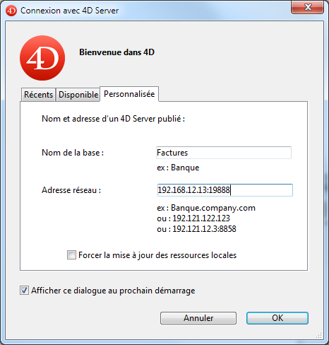 Note : Ce paramètre n’est pas pris en compte dans le cadre des applications client-serveur personnalisées. En principe, l’application cliente se connecte directement à l’application serveur, sans passer par la boîte de dialogue de connexion. Toutefois, en cas d’erreur, cette boîte de dialogue apparaît ; dans ce cas, le nom de publication de l’application serveur est le nom de la base compilée.