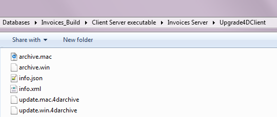 Quando é gerada uma nova versão da aplicação cliente/servidor utilizando o gerador de aplicações, a nova parte cliente é copiada como um arquivo comprimido na subpasta Upgrade4DClient da pasta Nomeaplicação Server (sob Mac OS, estas pastas são incluídas no pacote servidor). Se você seguiu o processo para a geração de uma aplicação cliente multiplataforma, um arquivo de atualização estará disponível para cada plataforma: