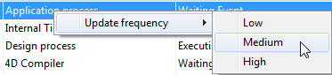 O Explorador de execução mostra o tempo de processamento de cada processo. Se abrir o gráfico do processo, poderá ver a seguinte informação:Pode modificar a frequência com a qual atualizar a informação, que pode ser a cada um, dois ou três segundos. Escolha um valor no menu "Frequência de atualização" localizado na parte inferior da janela. Quanto maior o tempo de atualização, mais tempo de CPU é consumido pelo Explorador de Execução. O número de processos a serem representados graficamente na tela também influencia o tempo de CPU consumido pelo processo.