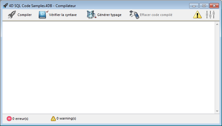 Le compilateur est intégré à 4D. La compilation d’une base de données s’effectue depuis la boîte de dialogue suivante :