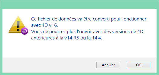 Ce fichier de données est alors converti en version 16 mais pourra toujours être ouvert et utilisé avec 4D v14.4 et suivantes ou 4D v15 (4D v14 R5).