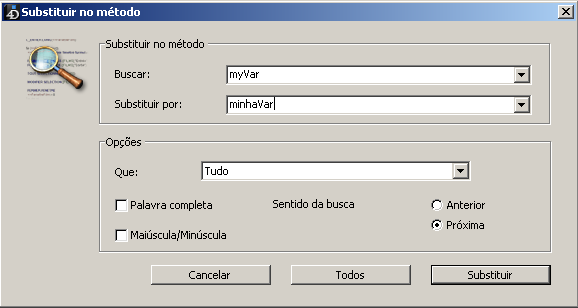 • Assim como na caixa de diálogo Buscar, os botões de opção Anterior e Próximo permitem definir o sentido da pesquisa: para o inídio ou final do método atual, começando desde a localização incial do cursor.