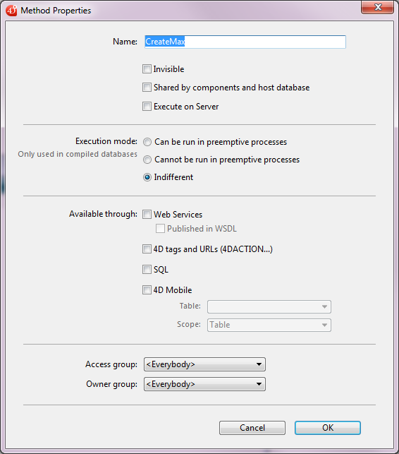 The "Owner group" drop-down list controls which group can edit the method in the Design environment. If a user who is not in this group attempts to edit the method in the Design environment, 4D displays a message saying that the user does not have the access privilege to edit the method.