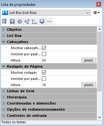 Estes temas administram a visualização e a altura dos cabeçalhos e dos pés de colunas do list box. Tenha em conta que as áreas de cabeçalhos e de rodapés não são editáveis durante seu uso. Seus conteúdos sempre se calculam.