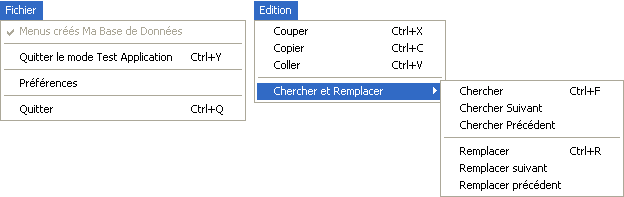 Dans cet exemple complet, nous allons créer par programmation une barre comportant les menus Fichier et Edition suivants :