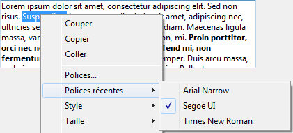 Ce menu contient les noms des dernières polices sélectionnées durant la session. Il est notamment utilisé par les zones de Notes de programmation.