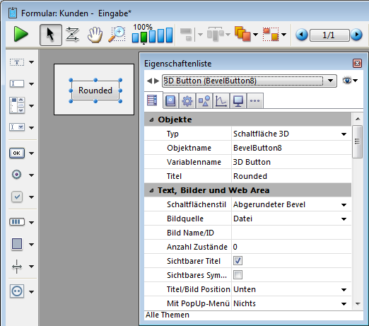 Fügt eine Schaltfläche mit abgerundeten Ecken mit vorformatierter 3D Darstellung hinzu. Sie können die Eigenschaften über die Eigenschaftenliste anpassen.