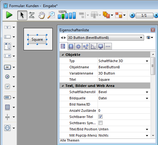 Fügt eine 3D Schaltfläche mit 2 Farbstufen mit vorformatierter Darstellung hinzu. Sie können die Eigenschaften über die Eigenschaftenliste anpassen.