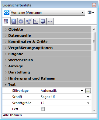 Sie können dieses Fenster auch im Formulareditor öffnen. Gehen Sie dazu in die Eigenschaftenliste und klicken in der Gruppe Text neben dem DropDown-Menü Stilvorlage auf die Schaltfläche [...]: