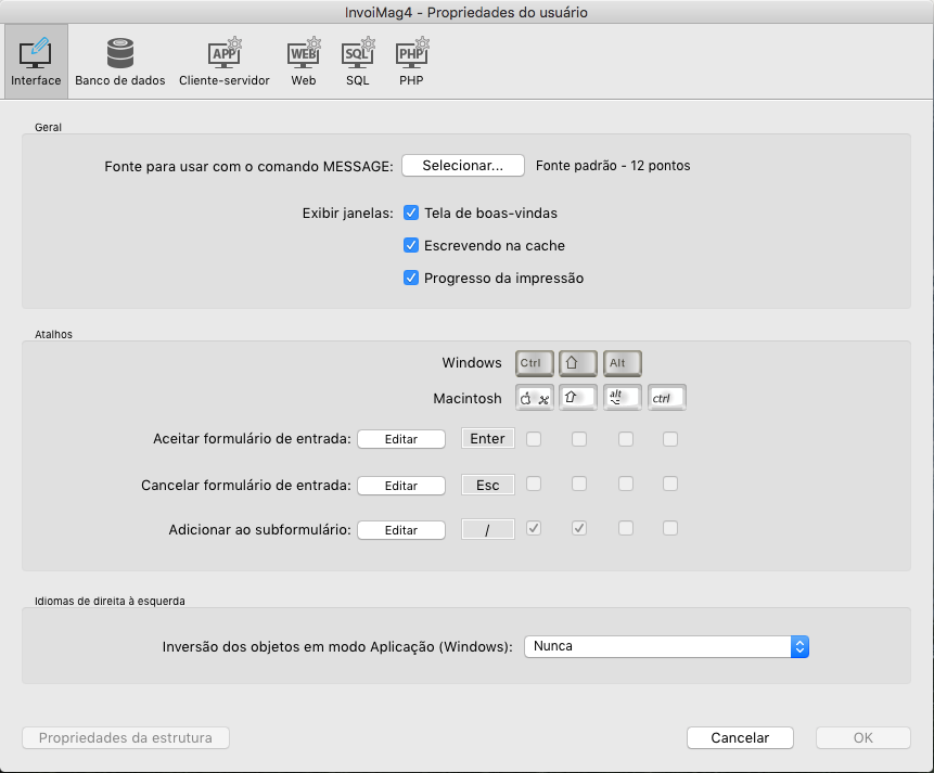 Nota: quando o arquivo de dados se encontra no mesmo nível que o arquivo de estrutura (normalmente quando um banco de dados é criado), os arquvos de configuração usuário baseados em dados e na estrutura compartem a mesma localização e arquivo. O comando de menu Configuração usuário para o arquivo de dados... não é proposto.