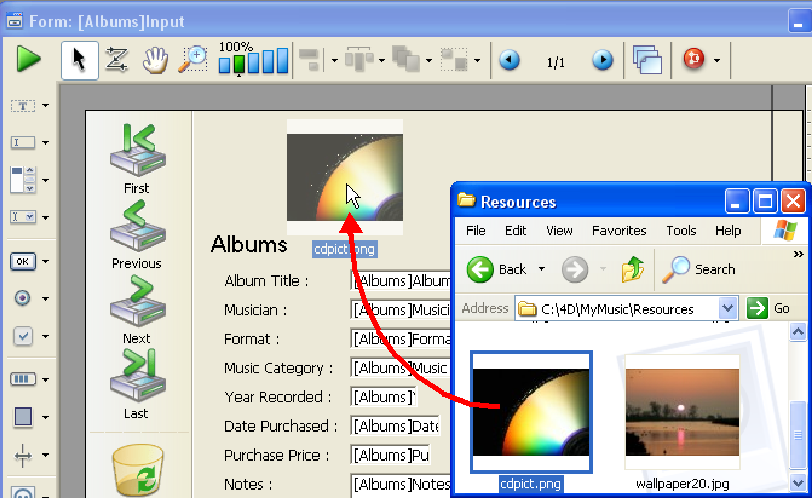 • You can insert a picture reference by dragging and dropping a file stored in the Resources folder of the database (see the “Automatic referencing of picture files” section below).