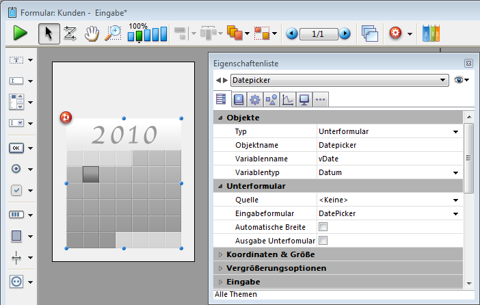 Hinweis: Date Picker, Pop-Up Datum und Datums-Eingabebereiche nutzen zu Beginn alle dieselbe Datumsvariable und zeigen bei Verwenden im gleichen Formular das jeweils zutreffende Datum.