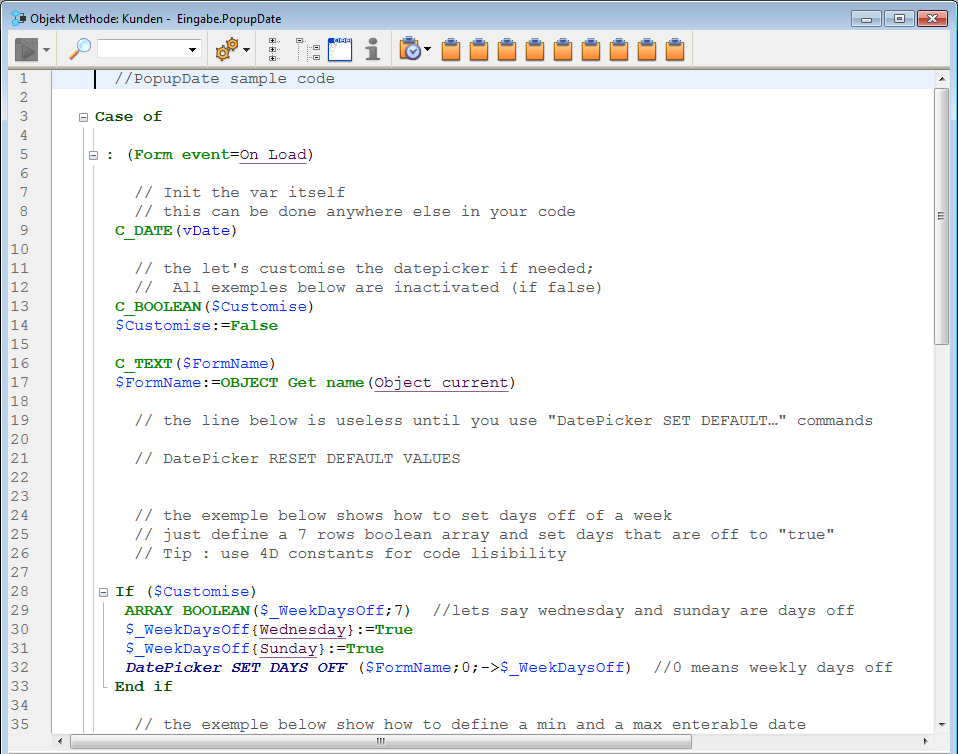 Sie können den Beispielcode in der Objektmethode mit den Befehlen für das Widget Date Picker verändern.