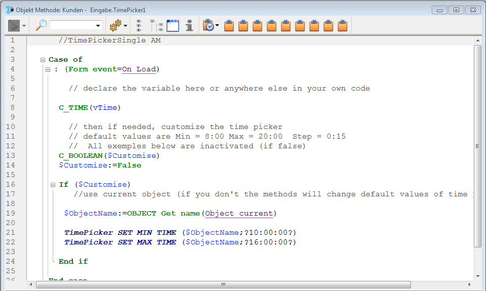 Die jeweilige Objektmethode enthält Beispielcode, den Sie über die Befehle des Widget Time Picker verändern können.