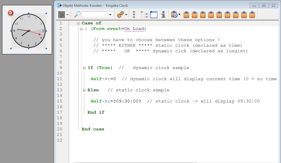 Die Objektmethode enthält Beispielcode, den Sie über die Befehle für das Widget Time Picker verändern können.