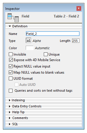 注: 4Dでは、フィールドに"必須入力"属性を設定することもできます。2つの設定のコンセプトは似ていますが、スコープが異なります。"必須入力"属性はデータ入力コントロールであり、“NULL値の入力を拒否”属性はデータベースエンジンレベルで動作します。