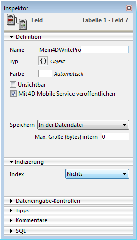 - Seine Attribute, wie z.B. "Mit 4D Mobile Service veröffentlichen" und seinen Index