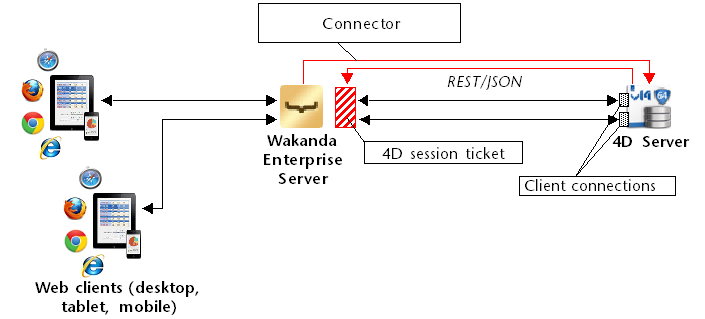 Cuando se inicia la solución Wakanda, Wakanda Enterprise server establece un enlace con 4D Server en función de los parámetros definidos en la caja de diálogo "Connect to Remote Datastore" o de los métodos JavaScript de conexión. Una vez la conexión es aceptada por 4D Server (ver el párrafo Control de acceso REST), un "tiquete" de sesión cliente 4D Mobile se entrega al servidor Wakanda. Este tiquete será utilizado por Wakanda para todas las peticiones cliente REST posteriores.