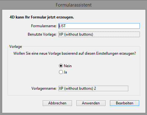 4D bietet an, die gerade definierten Einstellungen in einer Vorlage zu speichern. Eine Vorlage sichert alle Einstellungen zum Anzeigen (außer Felder), so dass Sie beim Erstellen weiterer Formulare Zeit sparen können.
