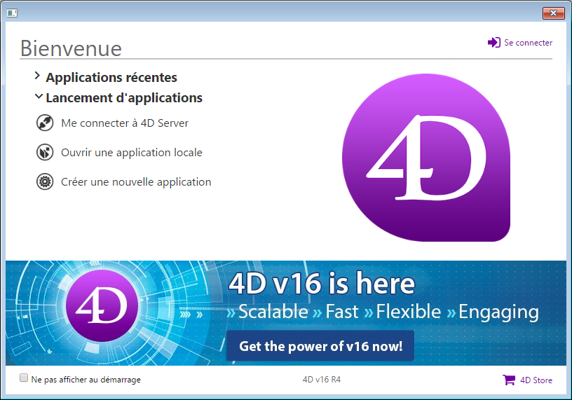 S'il s'agit du premier lancement de l'application 4D ou si vous n'avez pas modifié les paramètres de démarrage, la boîte de dialogue de bienvenue apparaît :