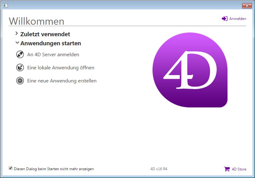 Starten Sie das 4D Programm zum ersten Mal oder haben Sie die Startup-Parameter nicht geändert, erscheint auf dem Bildschirm der Willkommen-Assistent: