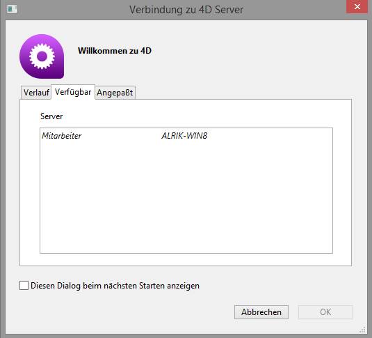3. Klicken Sie auf die Registerkarte Verfügbar, um die Liste der im Netzwerk veröffentlichten 4D Datenbanken anzuzeigen.