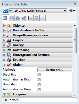 Um die Drag and Drop Features für Ihre 4D Write Pro Bereiche einzurichten, müssen Sie in der Eigenschaftenliste unter der Gruppe "Aktion" die passenden Optionen auswählen: