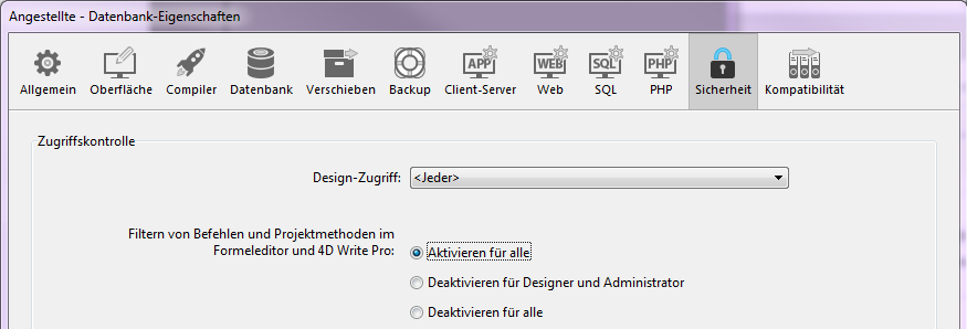 Ab 4D v16 greift beim Bewerten von 4D Befehlen und Projektmethoden, die in 4D Write Pro Dokumente eingefügt sind, die Einstellung zum Filtern auf Datenbankebene. In den Datenbank-Eigenschaften auf der Seite Sicherheit gibt es drei Möglichkeiten: