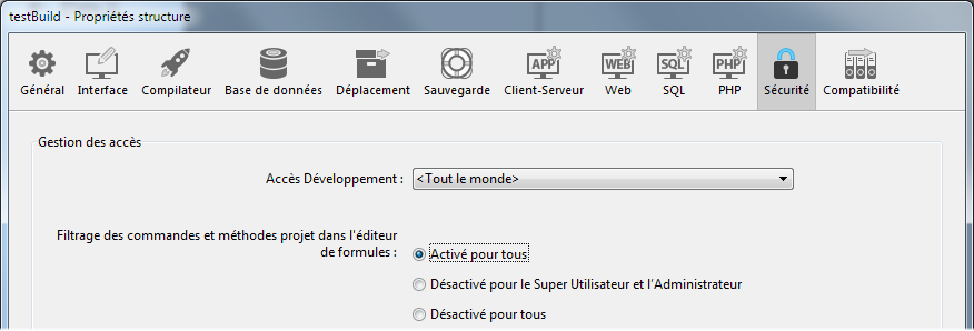 Par défaut, dans 4D, la valeur de cette option est Activé pour tous, ce qui signifie que les commandes et méthodes doivent être explicitement autorisées ; dans le cas contraire, des messages d'erreur sont retournés. Vous pouvez désactiver ce filtrage partiellement (pour le Super Utilisateur et l'Administrateur) ou pour tous les utilisateurs. Cette option est utilisée dans toute la base et contrôle toutes les évaluations de formule utilisateur. Pour plus d'informations sur cette option, veuillez vous référer au manuel Mode Développement.