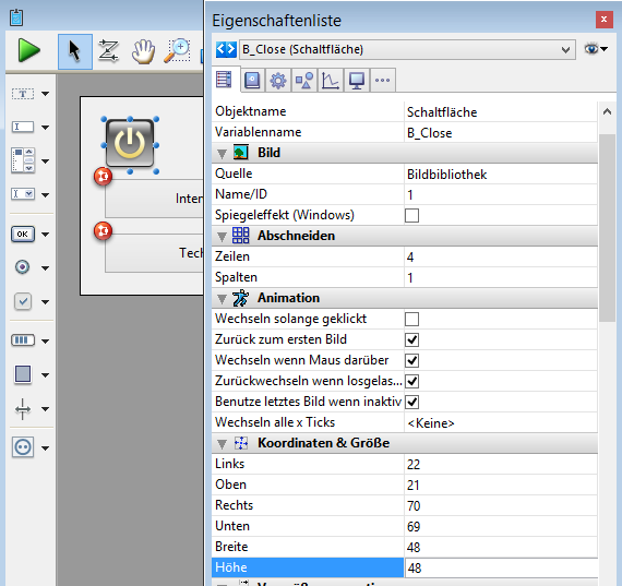 Die Schaltfläche ändert sich automatisch; sie sieht etwas gestaucht aus, aber wir bearbeiten die Eigenschaften, so dass wir 1 Spalte mit 4 Zeilen haben. Unter Höhe tragen wir 48 ein, unter Breite ebenso und dann wählen wir folgende Ereignisse:
