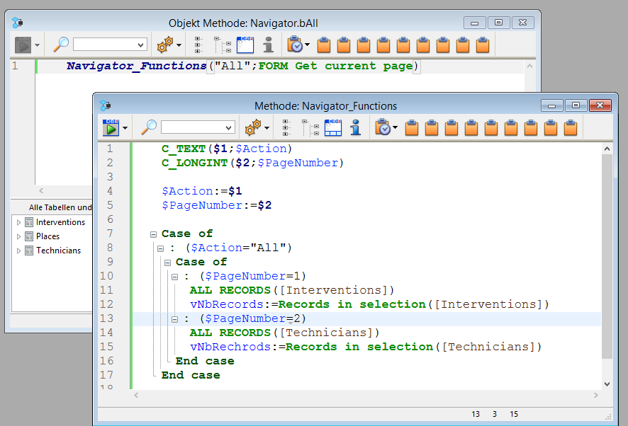Bei Doppelklick auf eine Methode erscheint deren Code. Bei Klick auf das kleine Dreieck sehen wir, dass die Methode Navigator_Functions aufgerufen wurde (mit den Parametern "All", FORM Get current page).