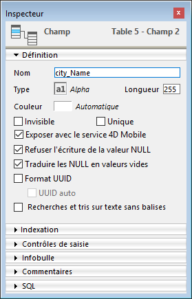 Note: Dans 4D, les champs peuvent également avoir l’attribut “Obligatoire”. Les deux notions sont proches mais leur portée est différente : l’attribut “Obligatoire” est un contrôle de saisie, tandis que l’attribut “Refuser l’écriture de la valeur NULL” agit au niveau du moteur de la base de données.