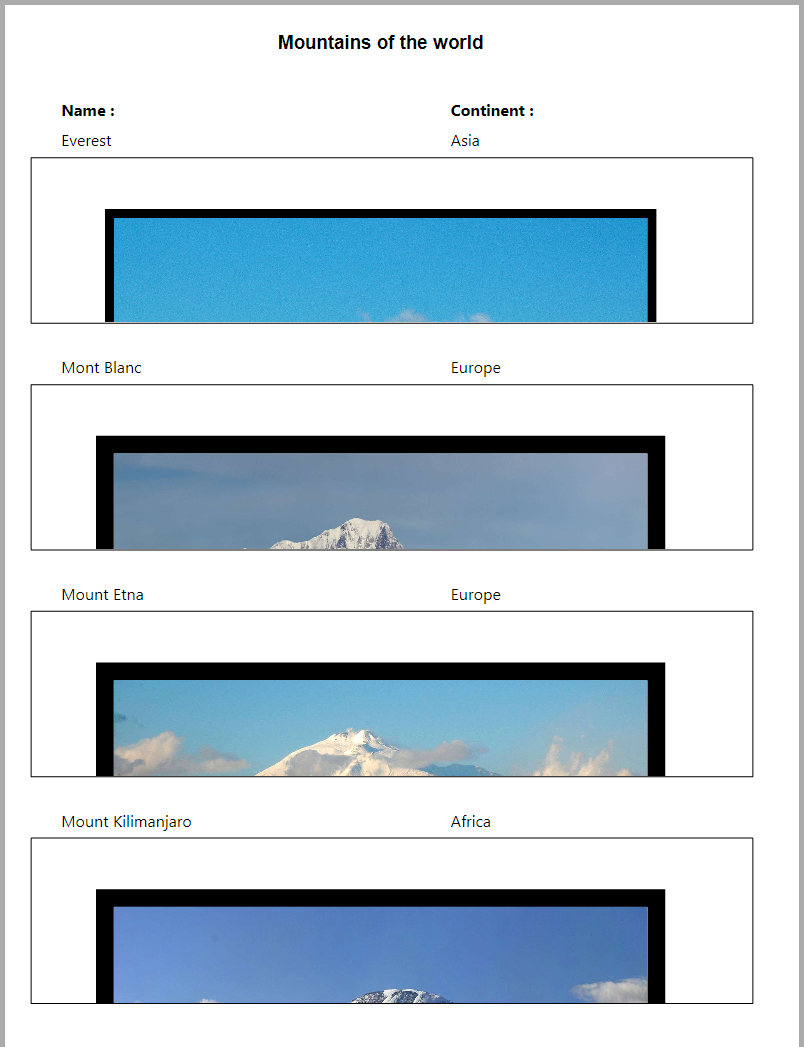 El siguiente ejemplo muestra el efecto de la opción Impresión tamaño variable en un área 4D Write Pro anidada en el formulario de salida por defecto. El siguiente código se ejecuta: