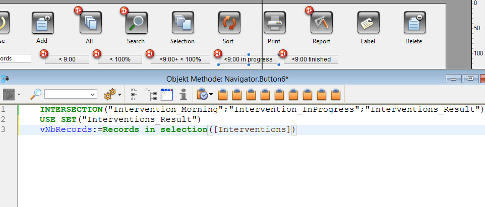 Testen wir die Schaltflächen, fällt auf, dass <9:00+ <100%, <9:00 in progress und <9:00 finished die hier angezeigte Zahl in vNbRecords nicht verändern.