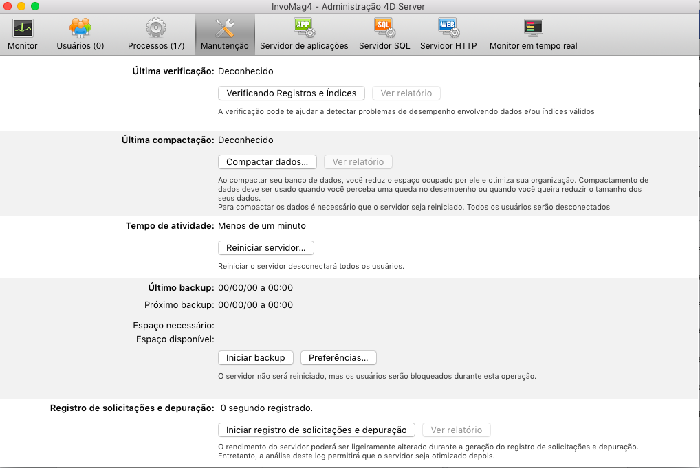O botão Backup da base permite iniciar o backup da base imediatamente usando os parâmetros atuais de backup (arquivos salvados, localização dos arquivos, opções, etc.). Você pode ver esses parâmetros clicando no botão Preferências.... Durante um backup no servidor, as máquinas clientes são "bloqueadas" (mas não desligadas) e não é possível conectar novos clientes. - Petições e depuração: Esta área indica a duração do registro do histórico de petições e dos eventos de depuração quando ele estiver ativo.