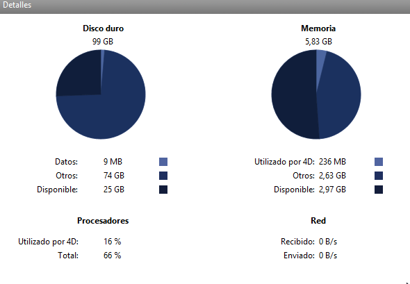 - Memoria: memoria RAM instalada en la máquina y cantidad de memoria ocupada por 4D Server, por las otras aplicaciones y memoria disponible.