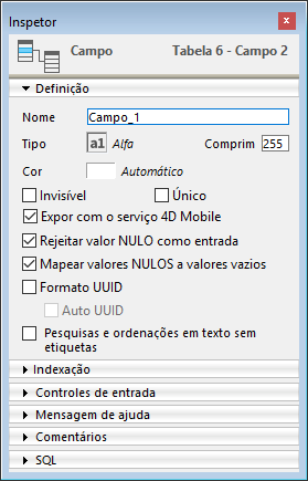 Nota: Em 4D, os campos também podem ter o atributo "Obrigatório". Os dois conceitos são similares, mas seu alcance é diferente: o atributo "obrigatório" é um controle de entrada, ainda que o atributo "Rejeitar valor NULO de entrada" trabalha ao nível do motor do banco de dados.
