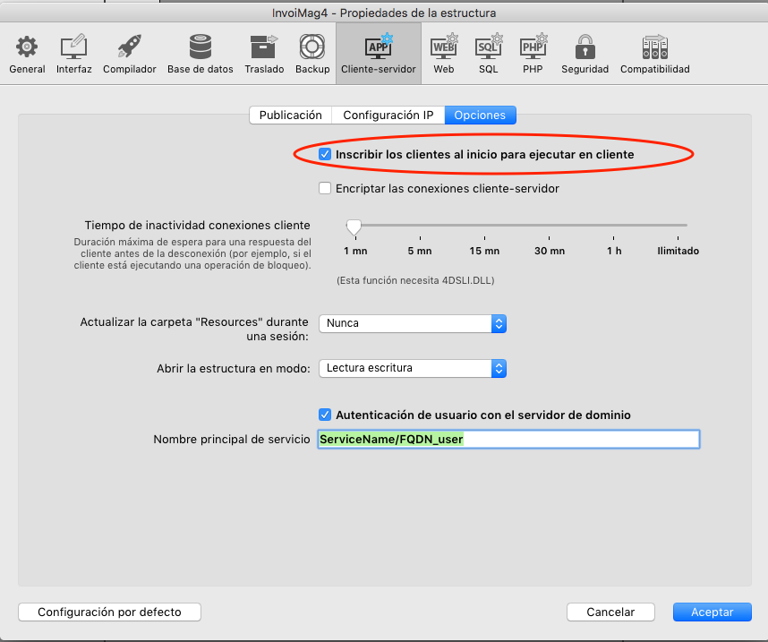 La casilla de selección "Inscribir los clientes al inicio para ejecutar en cliente" está disponible en los parámetros de la base, en la pestaña "Opciones de red" de la página "Cliente-Servidor”: