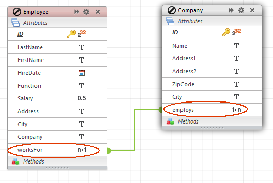 For example, let’s imagine that in the context of a "Employee/Company" structure, you create a relation from the [Employee] table to the [Company] table. You can characterize this relation by means of the name you give it: for example, you could name the many-to-one relation "worksFor" and the one-to-many relation could be "employs":
