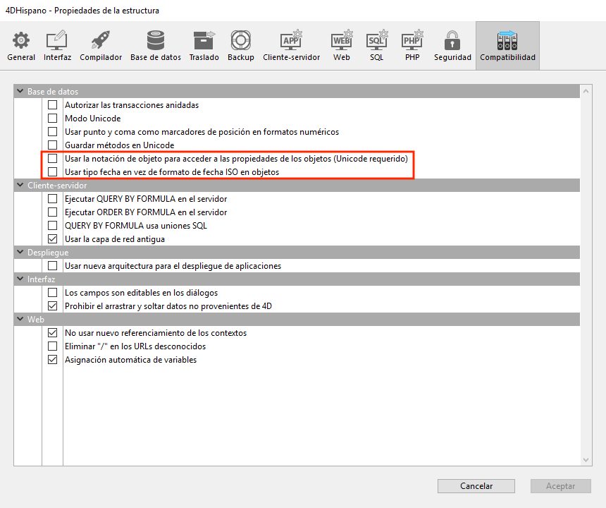 Mientras más antigua sea su base de 4D, más opciones se mostrarán: