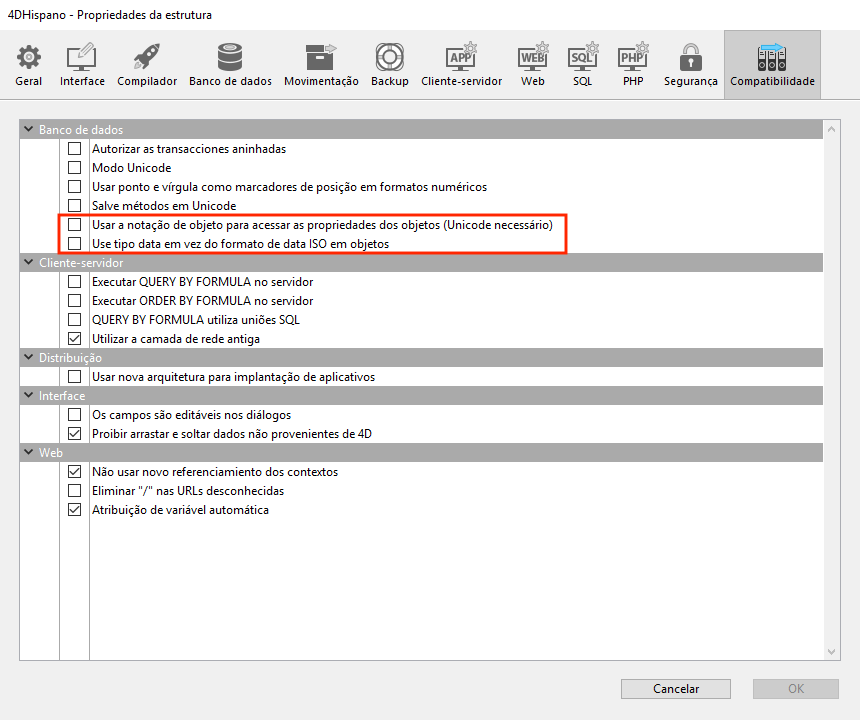 Ativar esta opção é obrigatória em um banco de dados criado em uma versão anterior a 4D v17 já que os caracteres ".", "[" e "]" eram permitidos anteriormente nos nomes destes elementos e agora são desaconselhados.