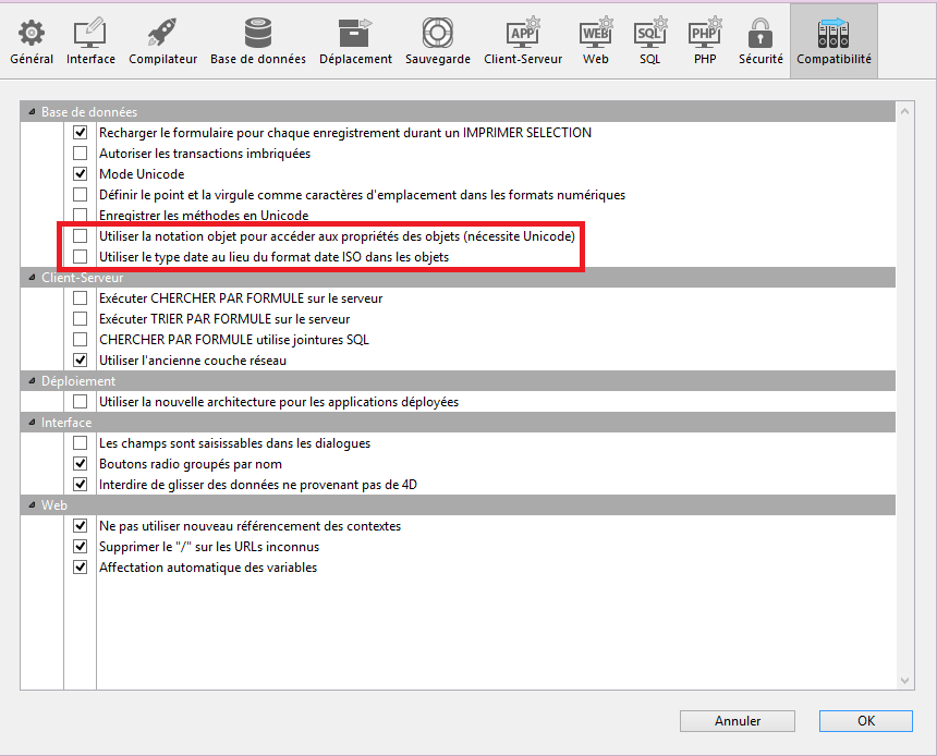 Pour plus d'informations sur ces options, cf. Page Compatibilité.