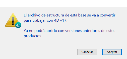 Su archivo de estructura se convierte a 4D v17 y no se puede abrir en una versión anterior.