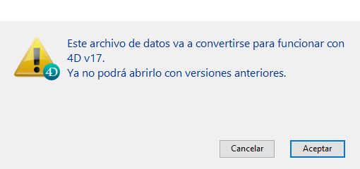 Este archivo de datos se convierte a la versión 17, pero aún se puede abrir y usar con 4D v15 o 4D v16.