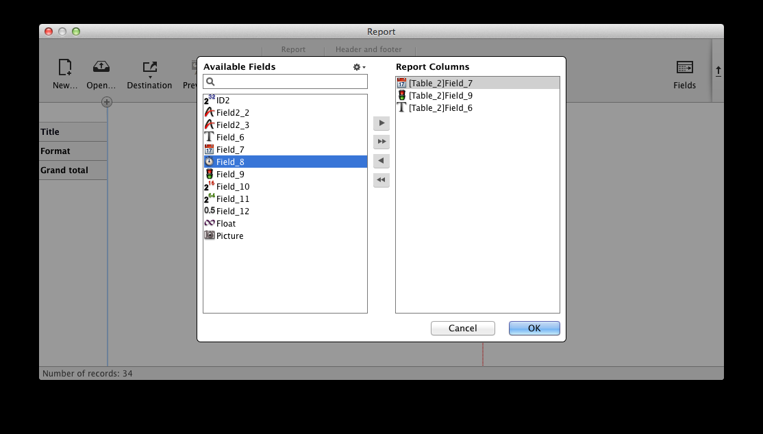 • 非表示のテーブルとフィールドは、クイックレポートエディターのフィールド一覧には表示されません。このプロパティの詳細な情報については、テーブルプロパティフィールドプロパティ の章にある "非表示" の段落を参照してください。