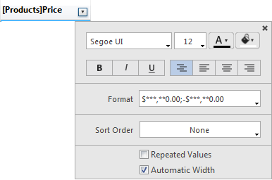• レポートに表示される任意のテキストに対して、フォント、フォントサイズ、行揃え、スタイルを指定できます。